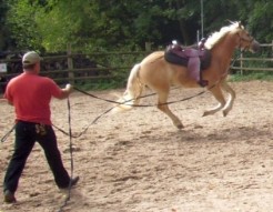 Das Arbeiten an der Doppellonge um die ersten Hilfen umzusetzen. Wenn das Fahren vom Boden aus klappt, dann ist es an der Zeit mit sog. Aufsitzübungen.